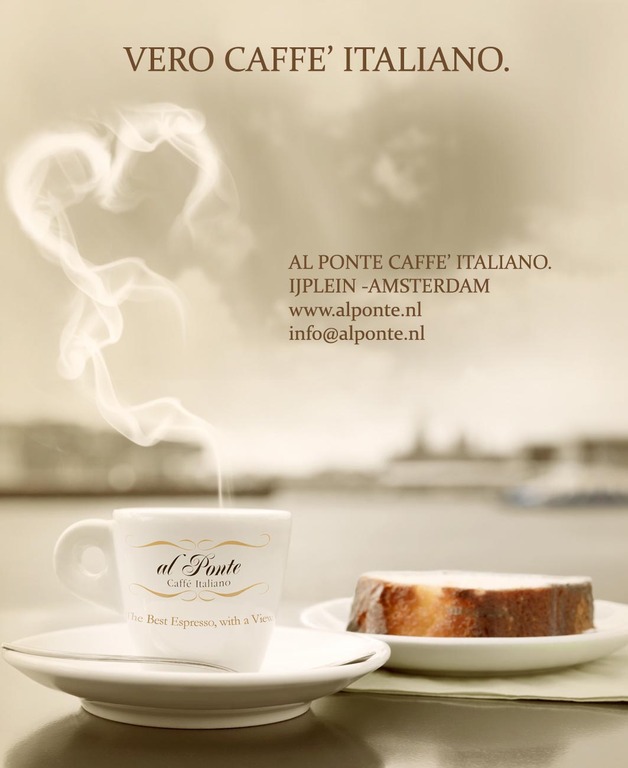 Taking the free ferry behind Central Station, direction IJPLEIN will bring you there in a beautiful 3 minutes sail. From Al Ponte you'll enjoy the most spectacular and unique view on Amsterdam. The place is famous for its authentic italian coffee.